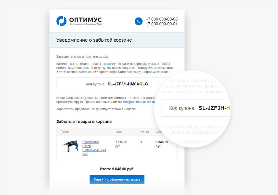 В среднем 70% заказов остаются неоформленными. По данным SeeWhy, 55,8% клиентов возвращаются из покупки из электронных писем. Конверсия в покупки при этом может достигать 67,7%.  Что делать? Рассылать письма тем, кто бросил корзины на этапе оформления заказа. Такие уведомления – как котенок, который просится вам под дверь: устоять невозможно.  Хотите, чтобы конверсия была еще выше? Используйте механику уведомления о забытой корзине с купоном на скидку.